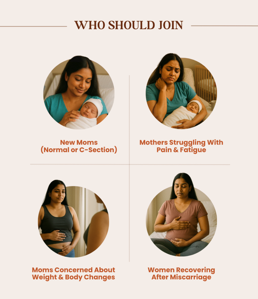 The Program is designed to support recovery after childbirth. It includes gentle yoga practices, breathing techniques, core and pelvic floor strengthening, guided relaxation, and lifestyle guidance to help mothers regain strength and balance.
