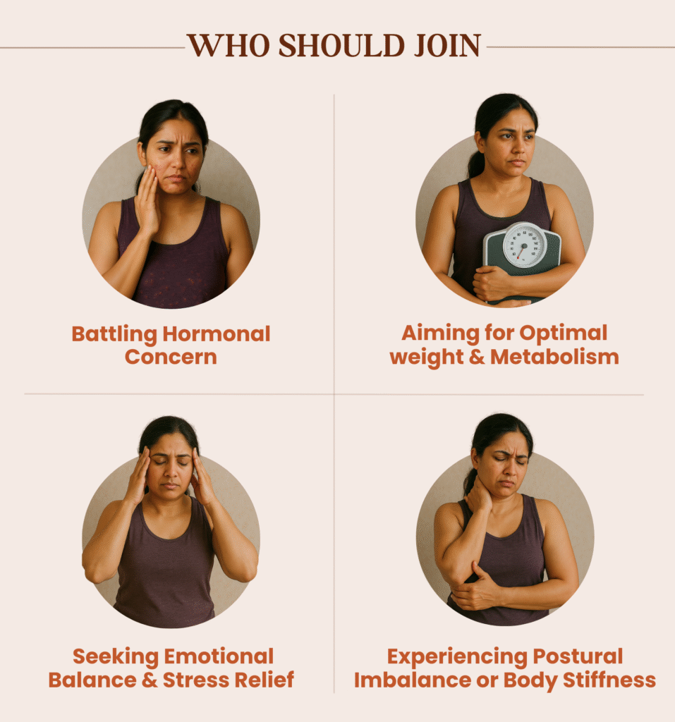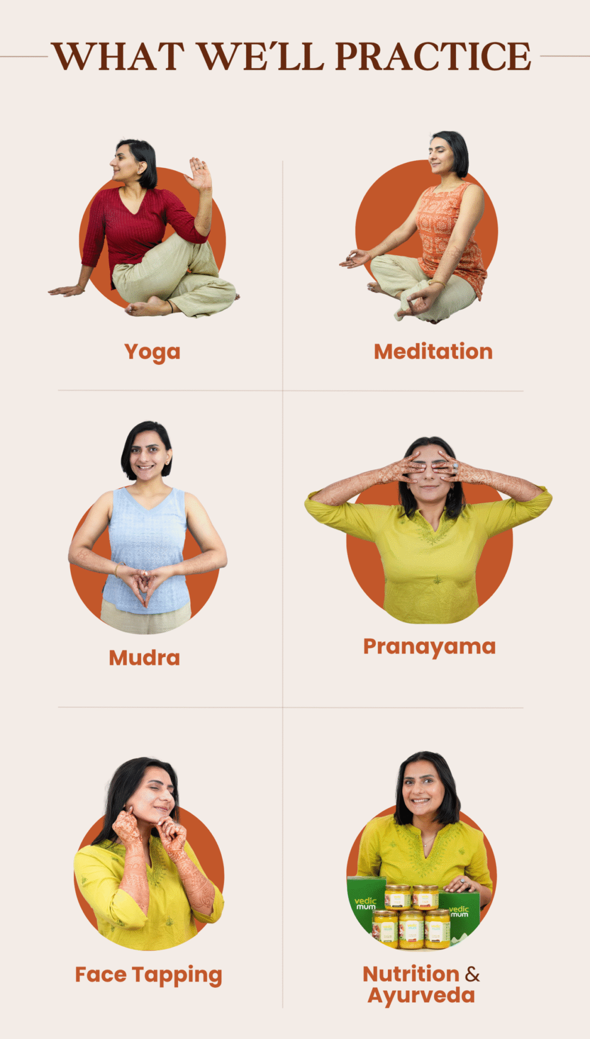 This program combines holistic techniques like Yoga, Pranayama, Meditation, EFT (Tapping Therapy), Face Yoga, Yog Nidra, Mudras, Ayurveda, Nutrition, and Posture Correction to help balance the doshas—Vata, Pitta, and Kapha.