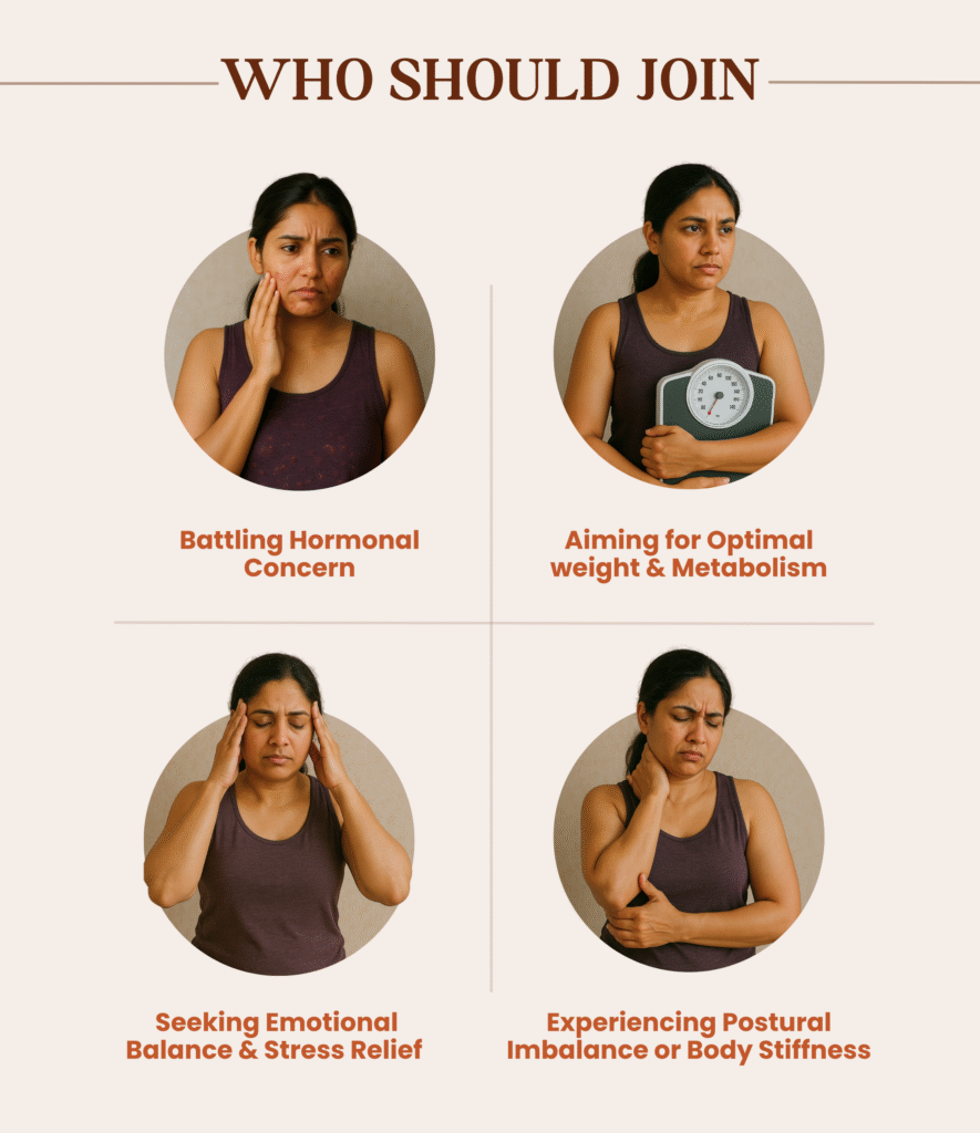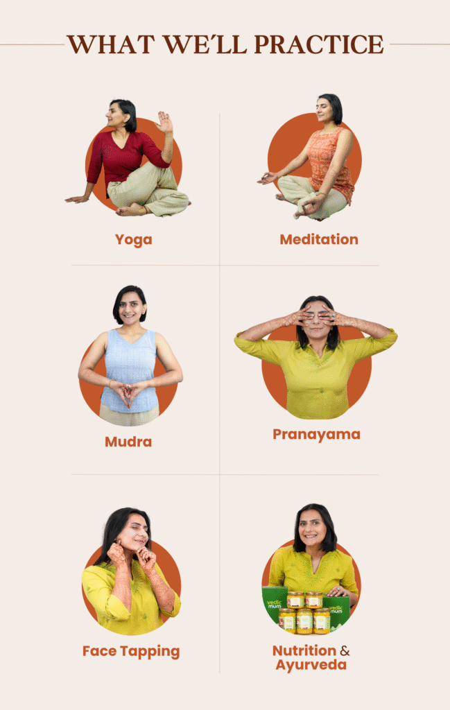This program combines holistic techniques like Yoga, Pranayama, Meditation, EFT (Tapping Therapy), Face Yoga, Yog Nidra, Mudras, Ayurveda, Nutrition, and Posture Correction to help balance the doshas—Vata, Pitta, and Kapha.
